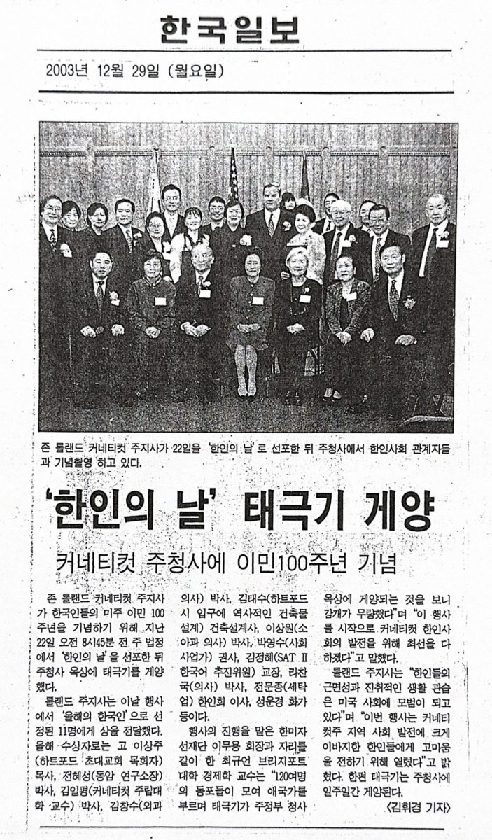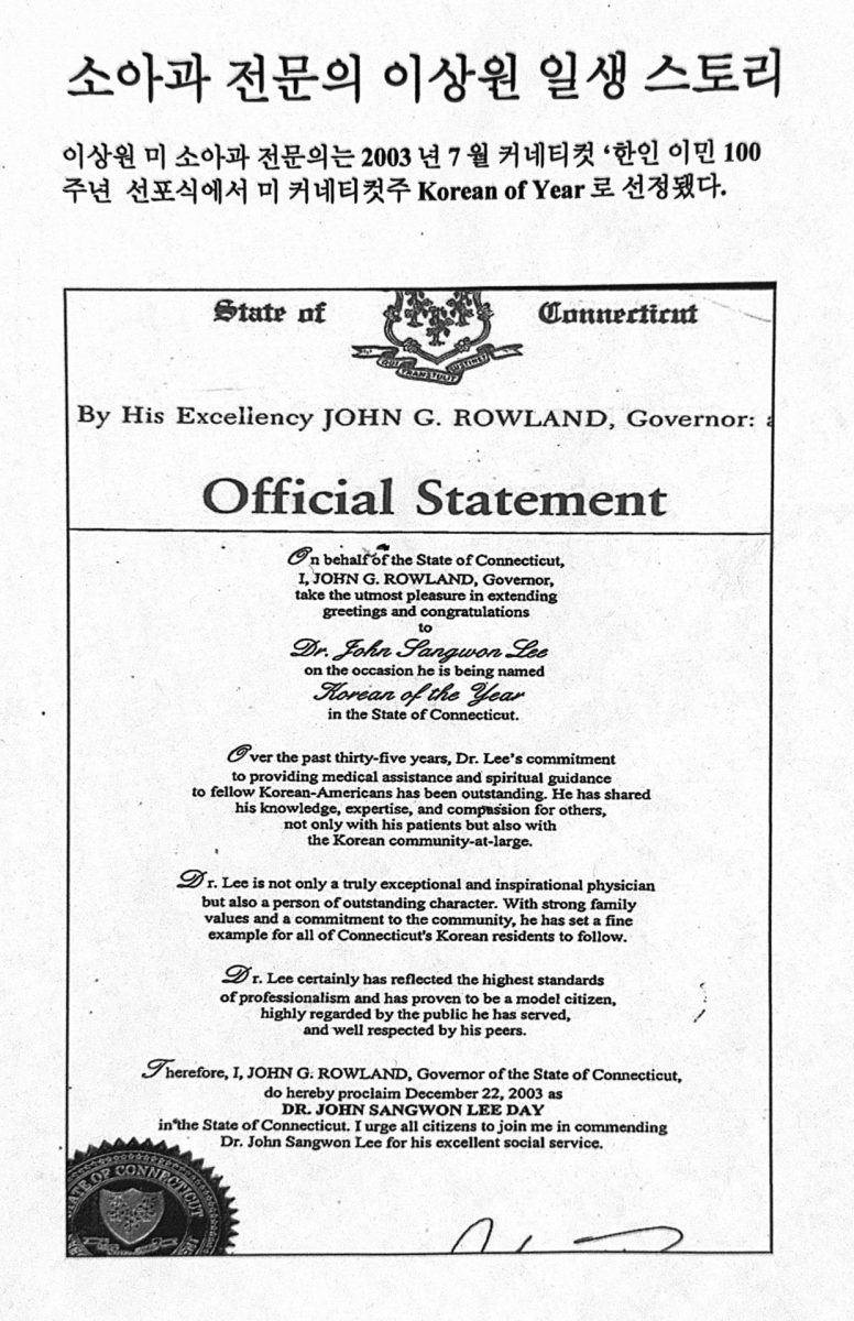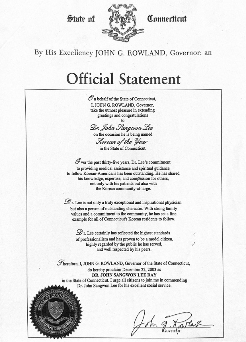 커네티컷 주지사 Governor John G Roland은 2003년 12월 22일을 커네티컷 주 Dr. John Sangwon Lee Day로 선포하며 커네티컷 전 시민이 그를 축하하기 바란다고 말했다.