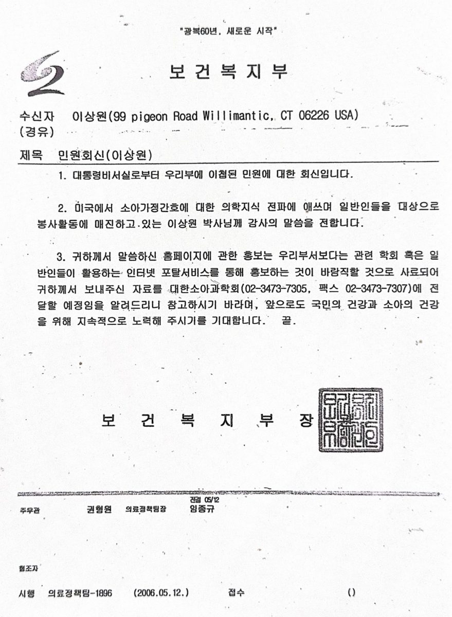 참고로 이상원 의사는 의사가 된 후, 약 50여 만명 이상 환자들의 건강증진 관리, 진료를 했으나 단 한건의 의료 사고나 진료 문제로 법적 문제가 생기지 않았다. 또 환자나 보호자로부터 서신 불평도 받은 적 없다. 하나님 감사합니다.