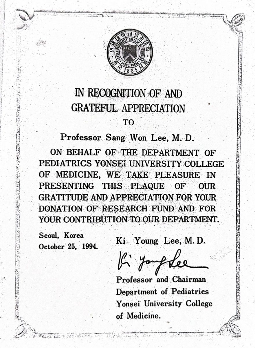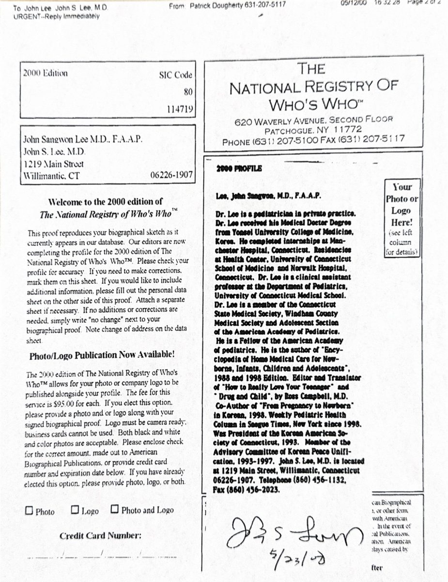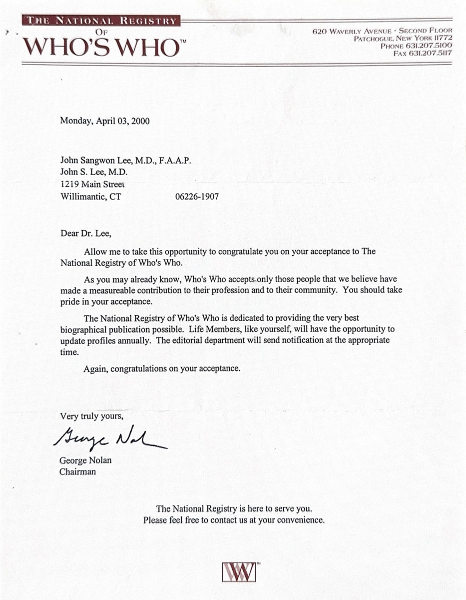 커네티컷 주지사 Governor John G Roland은 2003년 12월 22일을 커네티컷 주 Dr. John Sangwon Lee Day로 선포하며 커네티컷 전 시민이 그를 축하하기 바란다고 말했다.